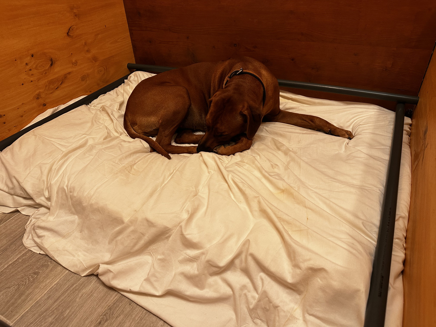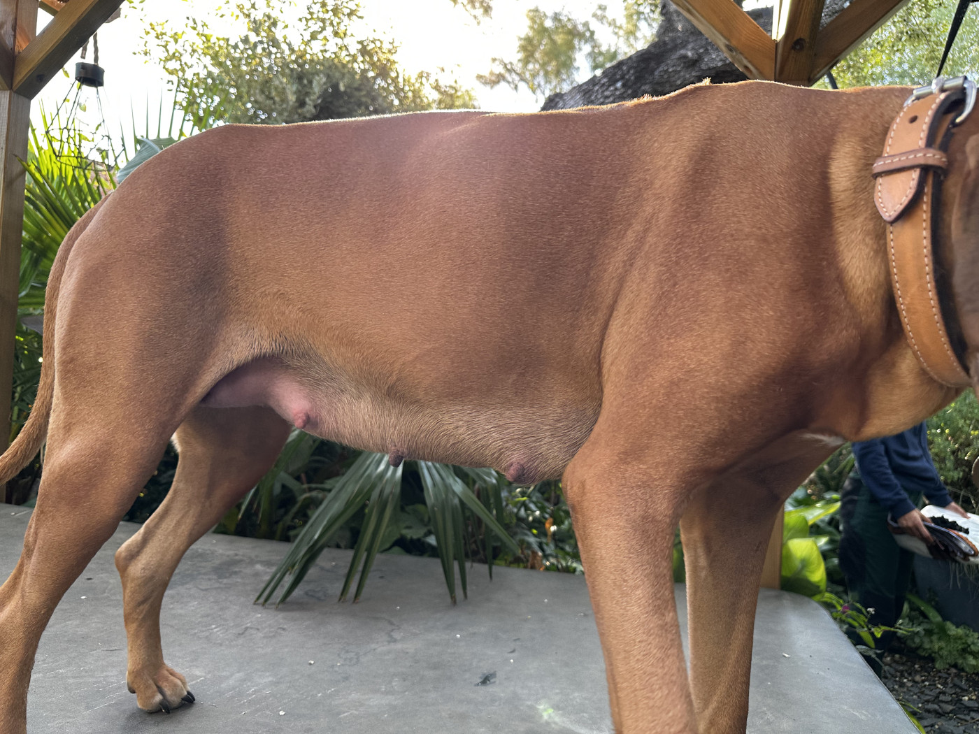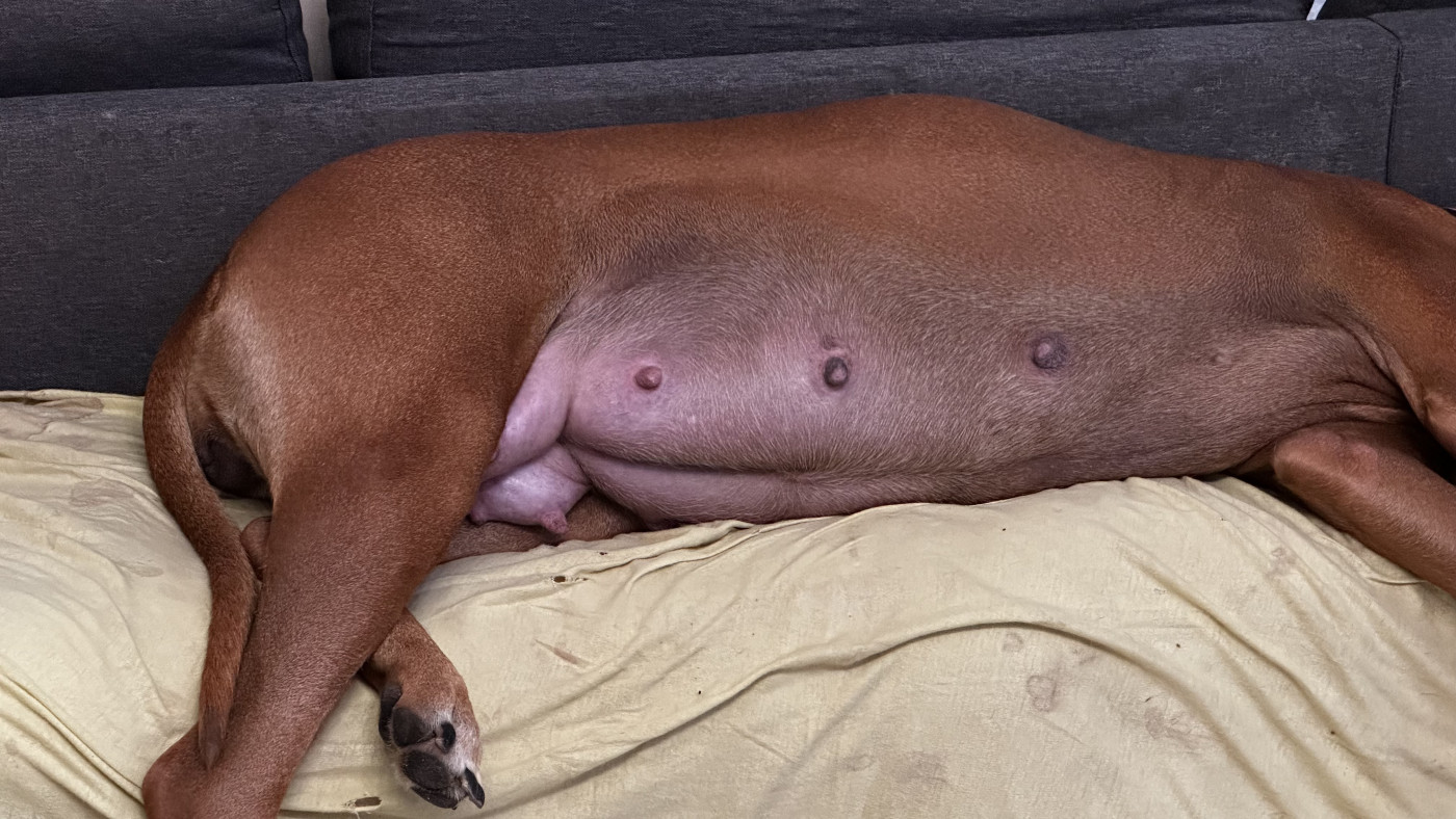 Gestation Talia ( dit Lila ) 2025 Tout début, on ne voit pas grand chose Dans sa caisse de mise bas bien au chaud Ça commence à se voir ! silence ! ça pousse.